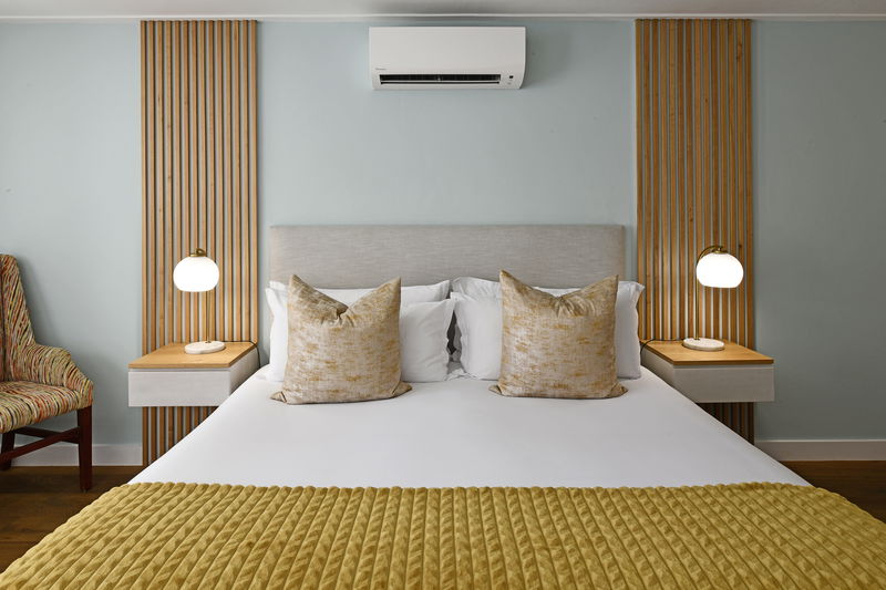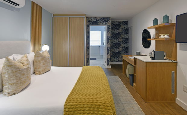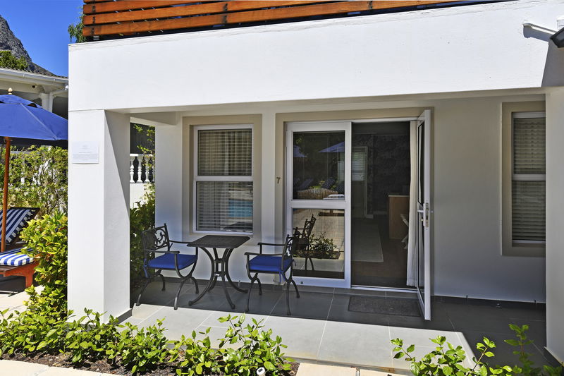 This beautifully appointed ground-floor room features a thoughtfully designed bedroom with direct access to a patio overlooking the pool.